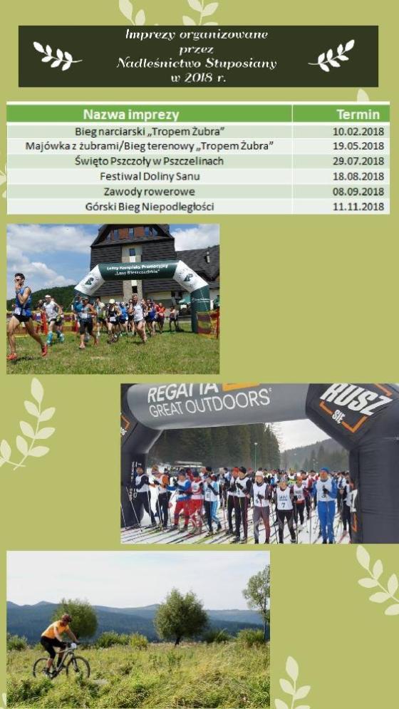 Już 19 maja odbędzie się III Edycja Bieszczadzkiego Biegu Terenowego „Tropem Żubra”, tym razem na zawodników czekać będą nowe atrakcje. W wakacje koniecznie trzeba przybyć do Nadleśnictwa na Święto Pszczoły w Pszczelinach 28 lipca. Doroczny Festiwal Górnego Sanu zaplanowany jest natomiast 18 sierpnia w Mucznem. Po wakacjach nie warto chować rowerów, ponieważ już 8 września, przy Centrum Promocji Leśnictwa w Mucznem, odbędą się zawody w kolarstwie górskim.